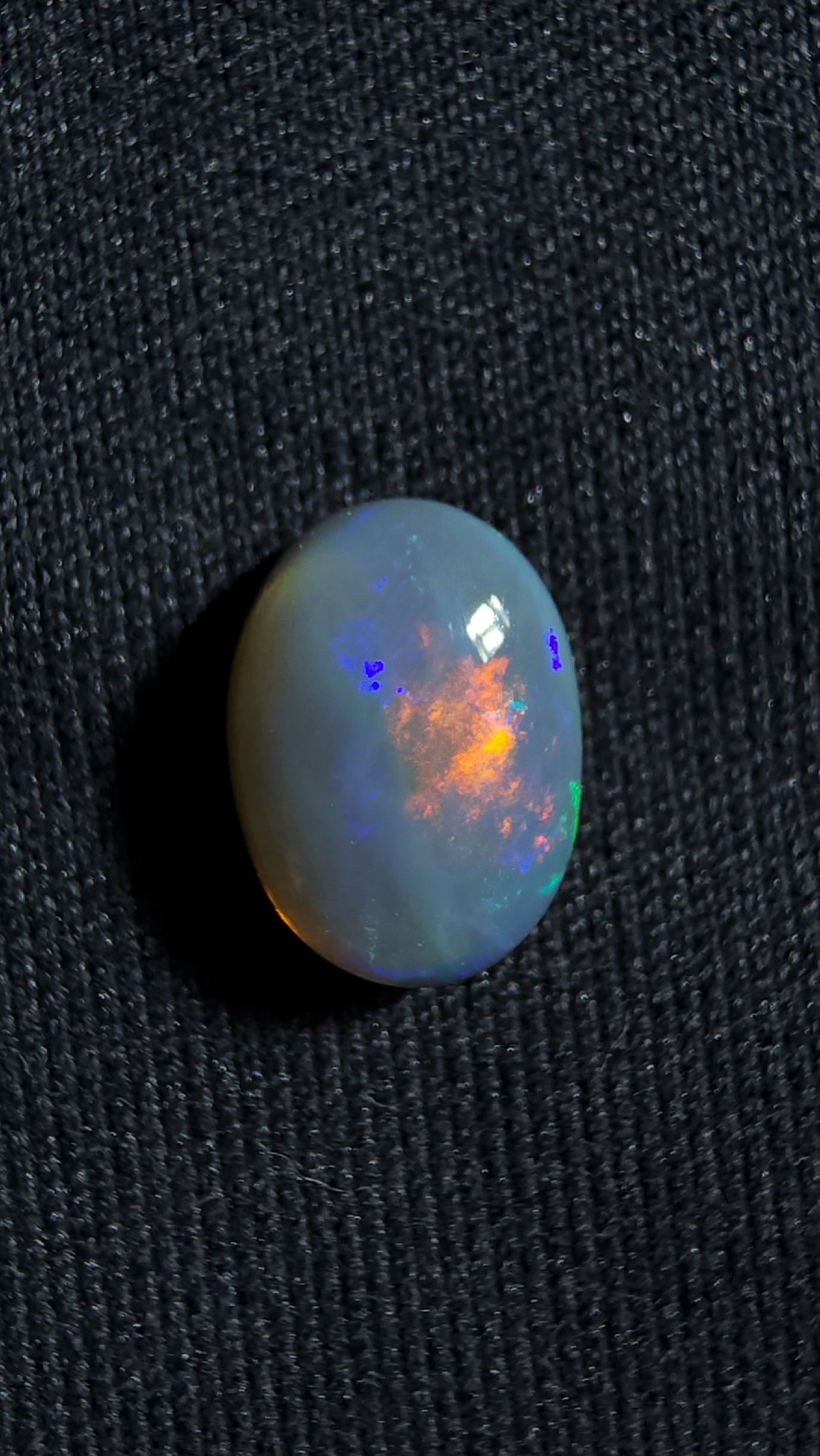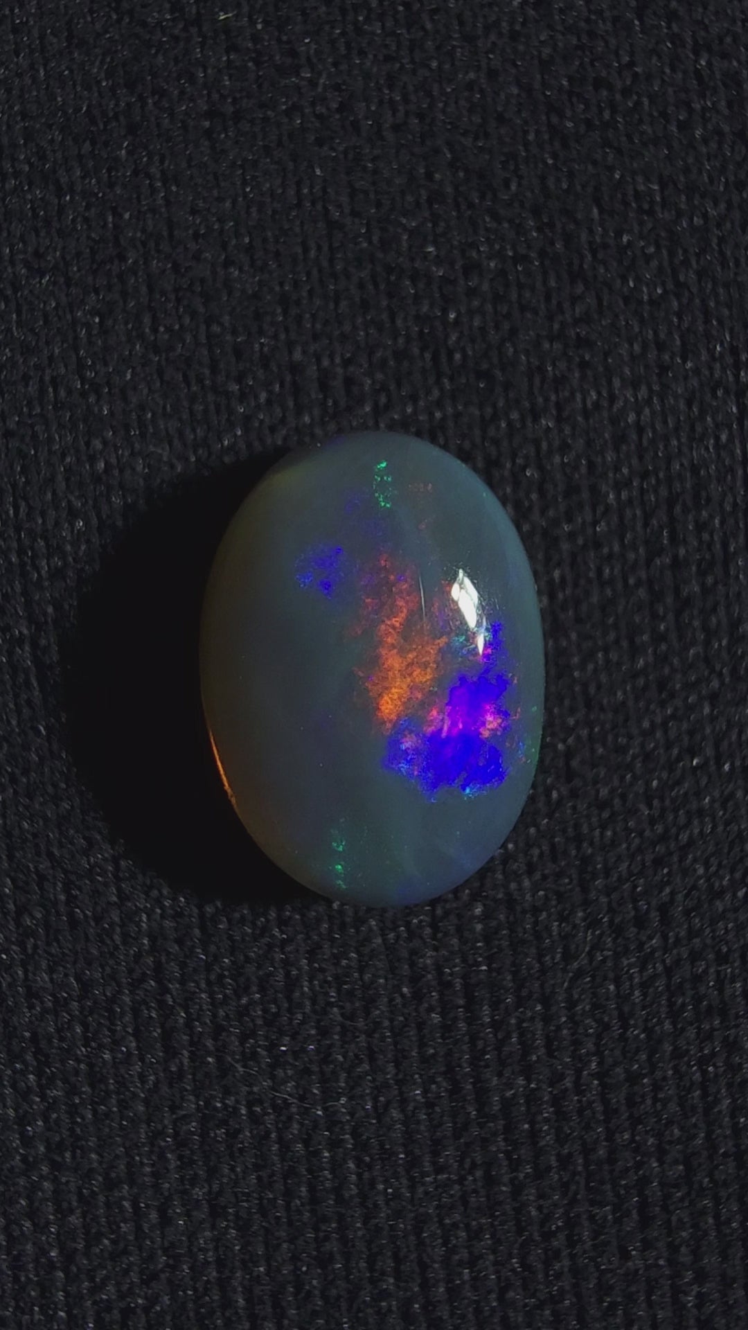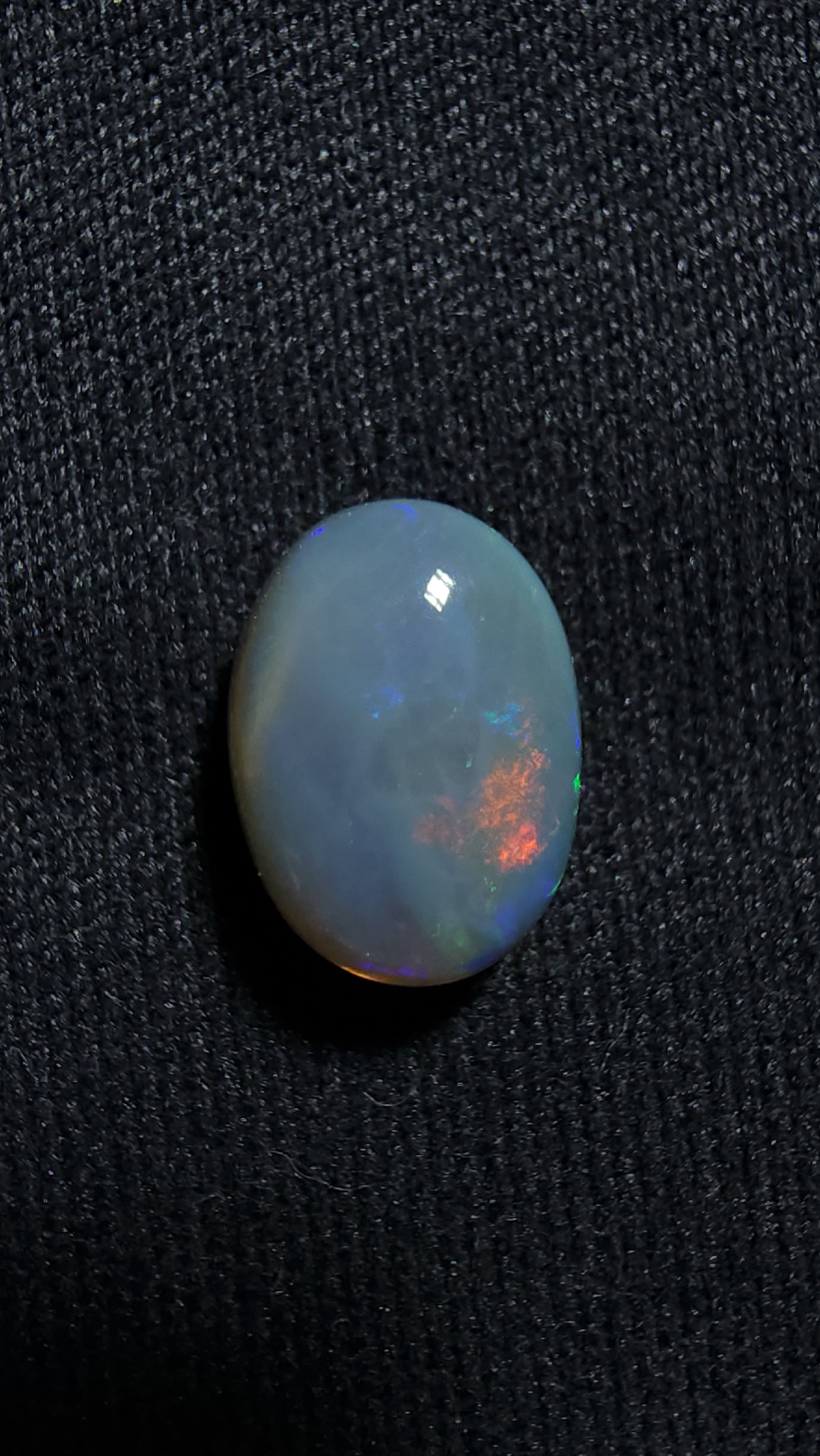 This beautiful Lightning Ridge opal carries a rare, blood red flash at its centre — a striking burst of warm colour surrounded by deep blues, greens, and hints of violet across a dark N5–N6 base.