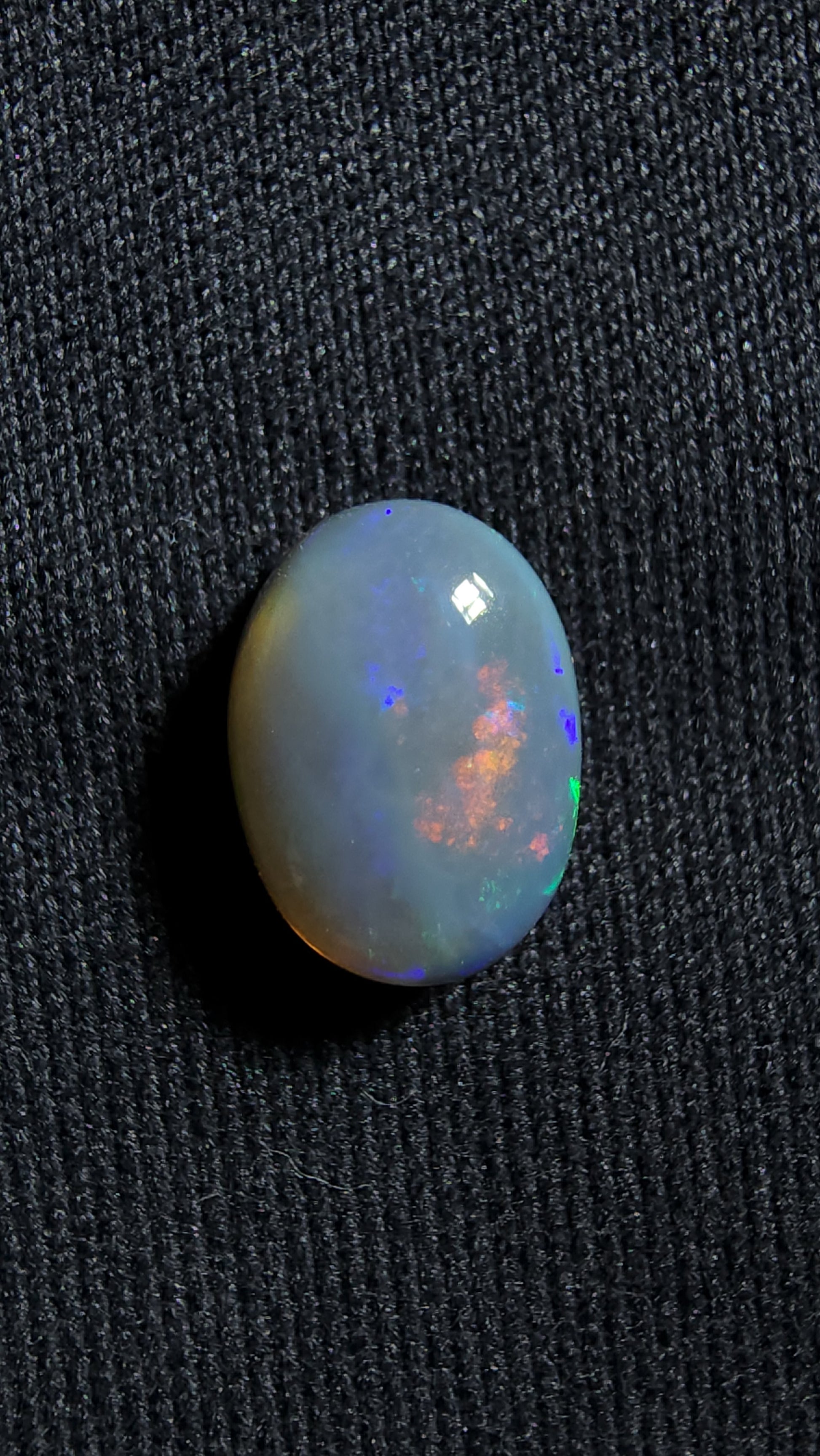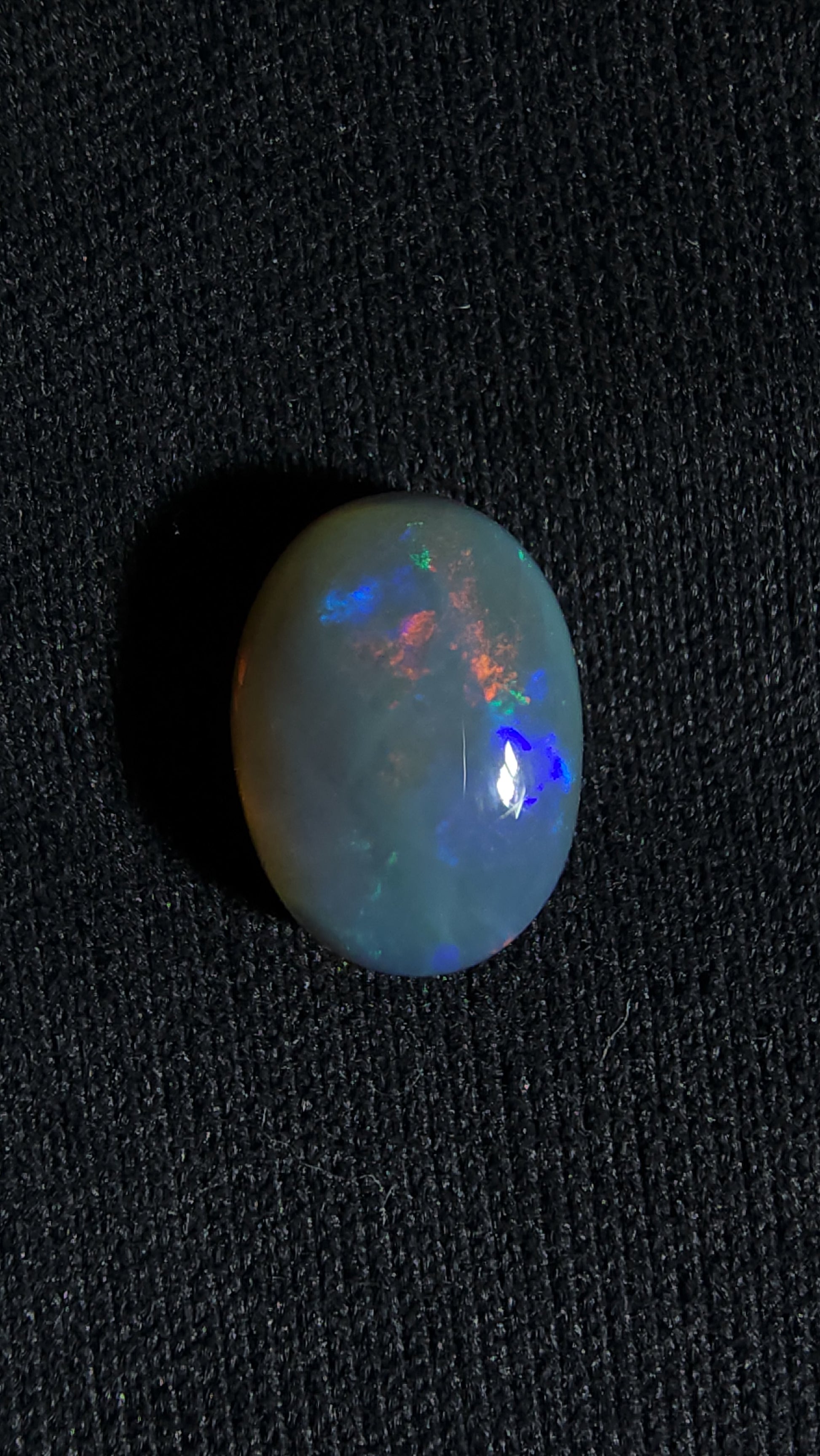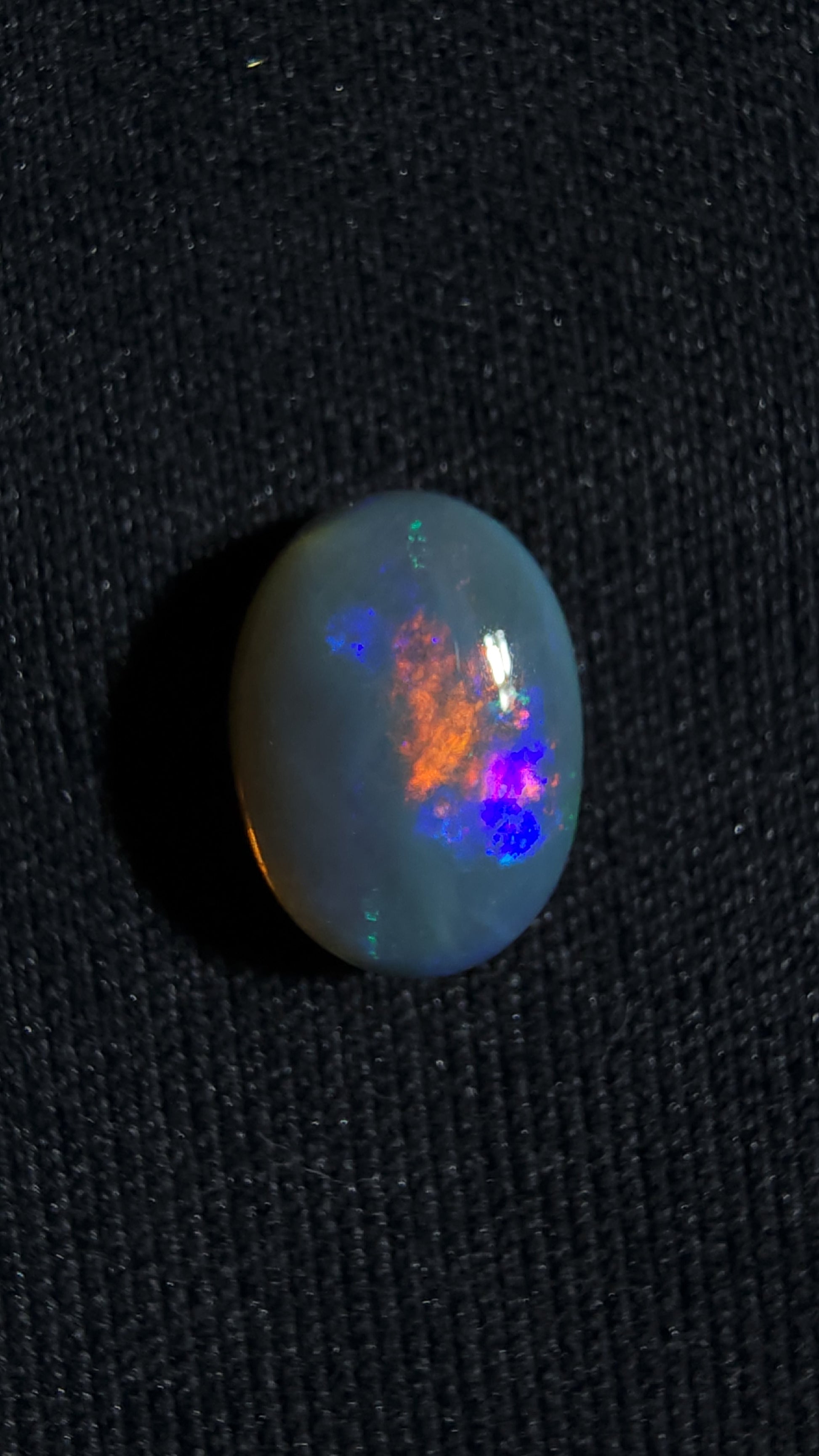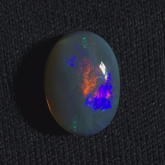 This beautiful Lightning Ridge opal carries a rare, blood red flash at its centre — a striking burst of warm colour surrounded by deep blues, greens, and hints of violet across a dark N5–N6 base.