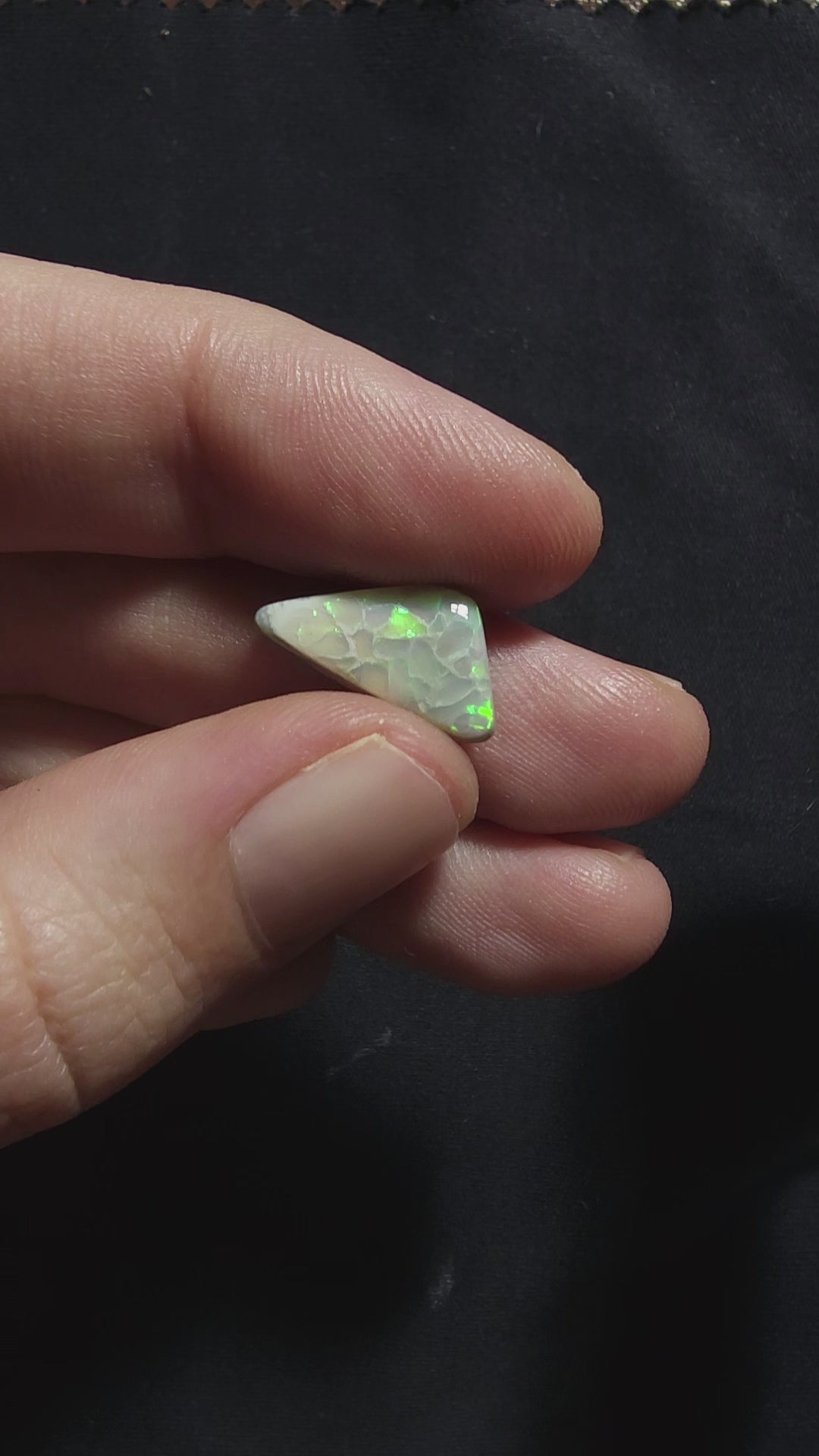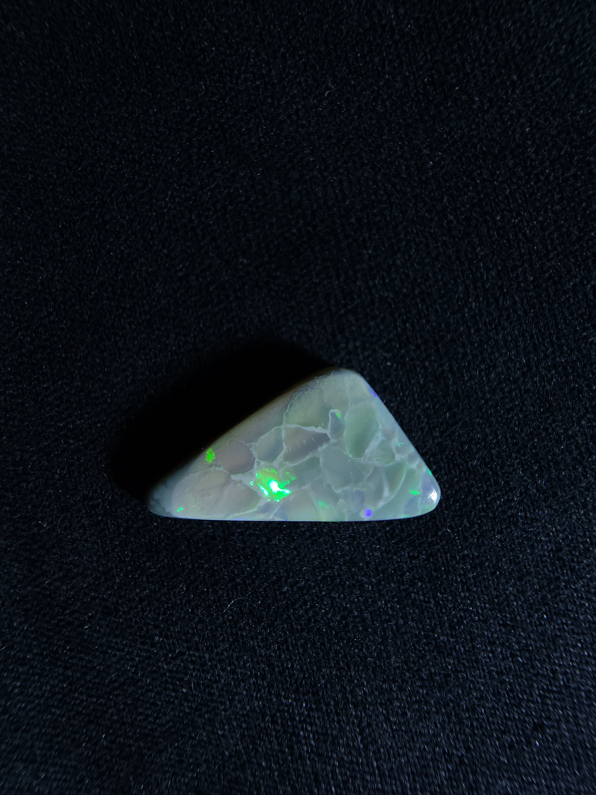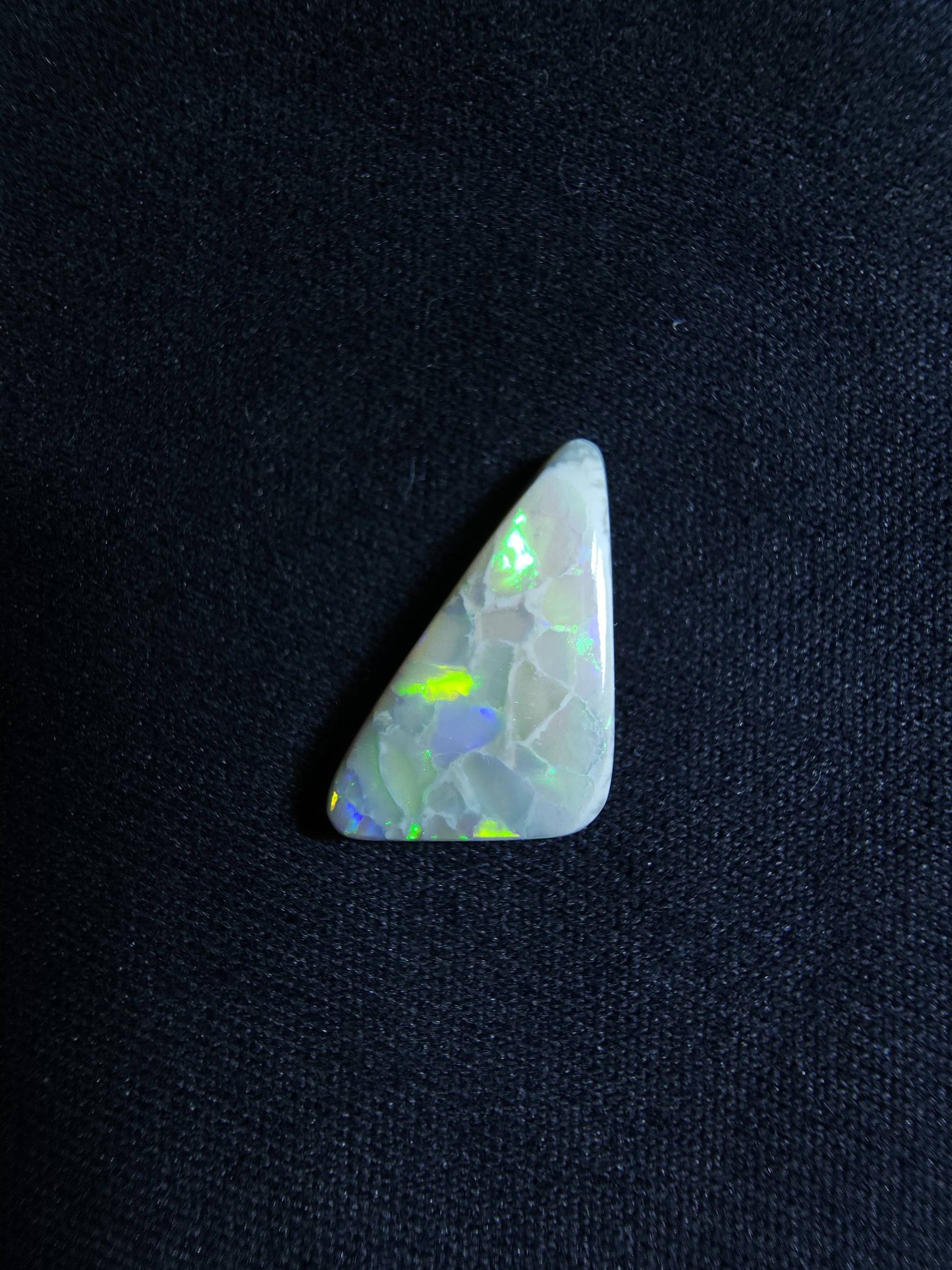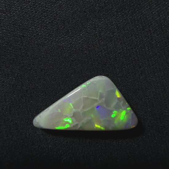 A natural Lightning Ridge seam opal with a bright green mosaic-style pattern across the face. Cut into a modern freeform shape, this stone shows crisp green flashes with hints of blue and yellow under direct light. A smooth, low-profile dome makes it an easy piece for bezel setting, pendants or contemporary ring designs.