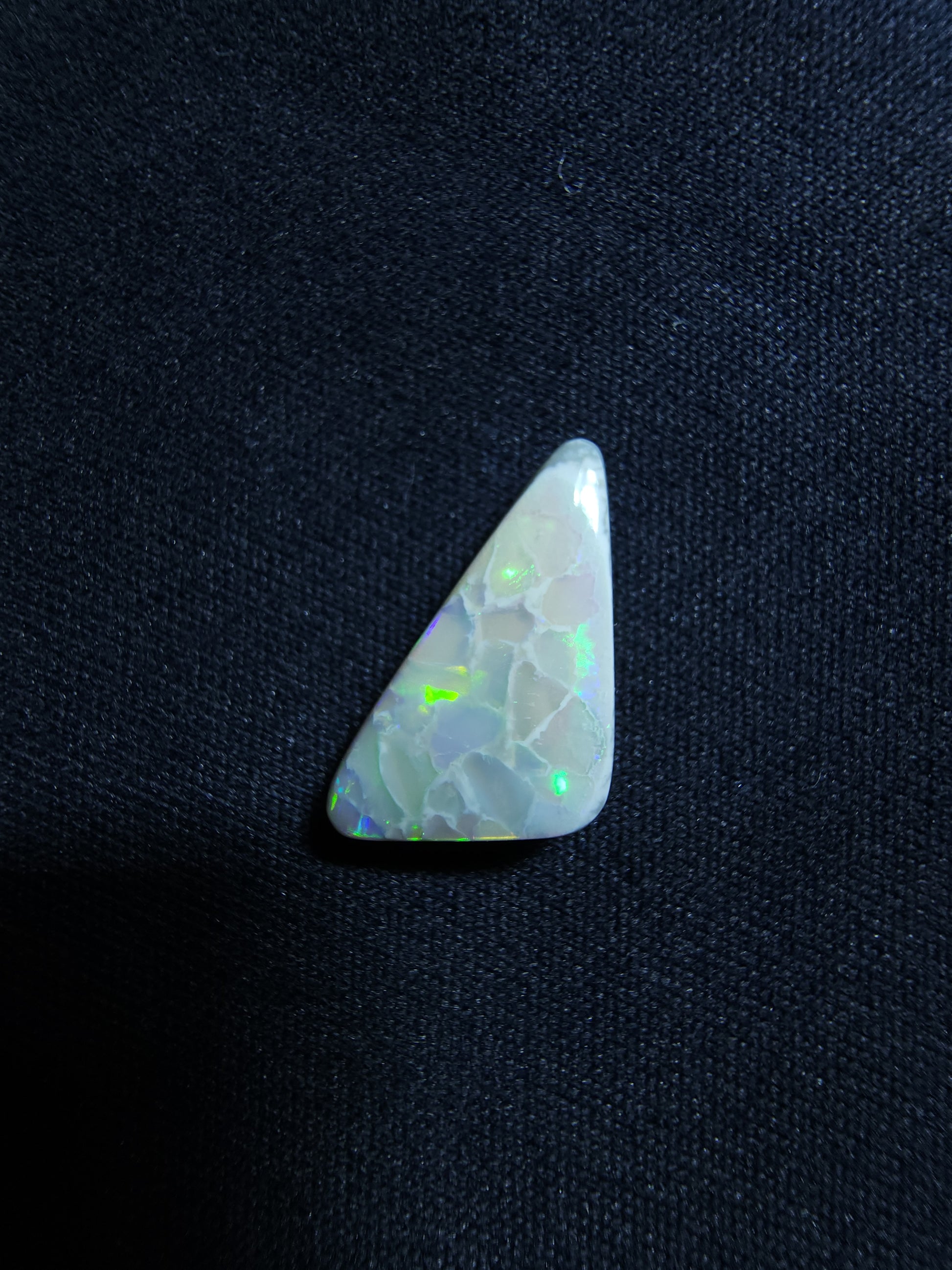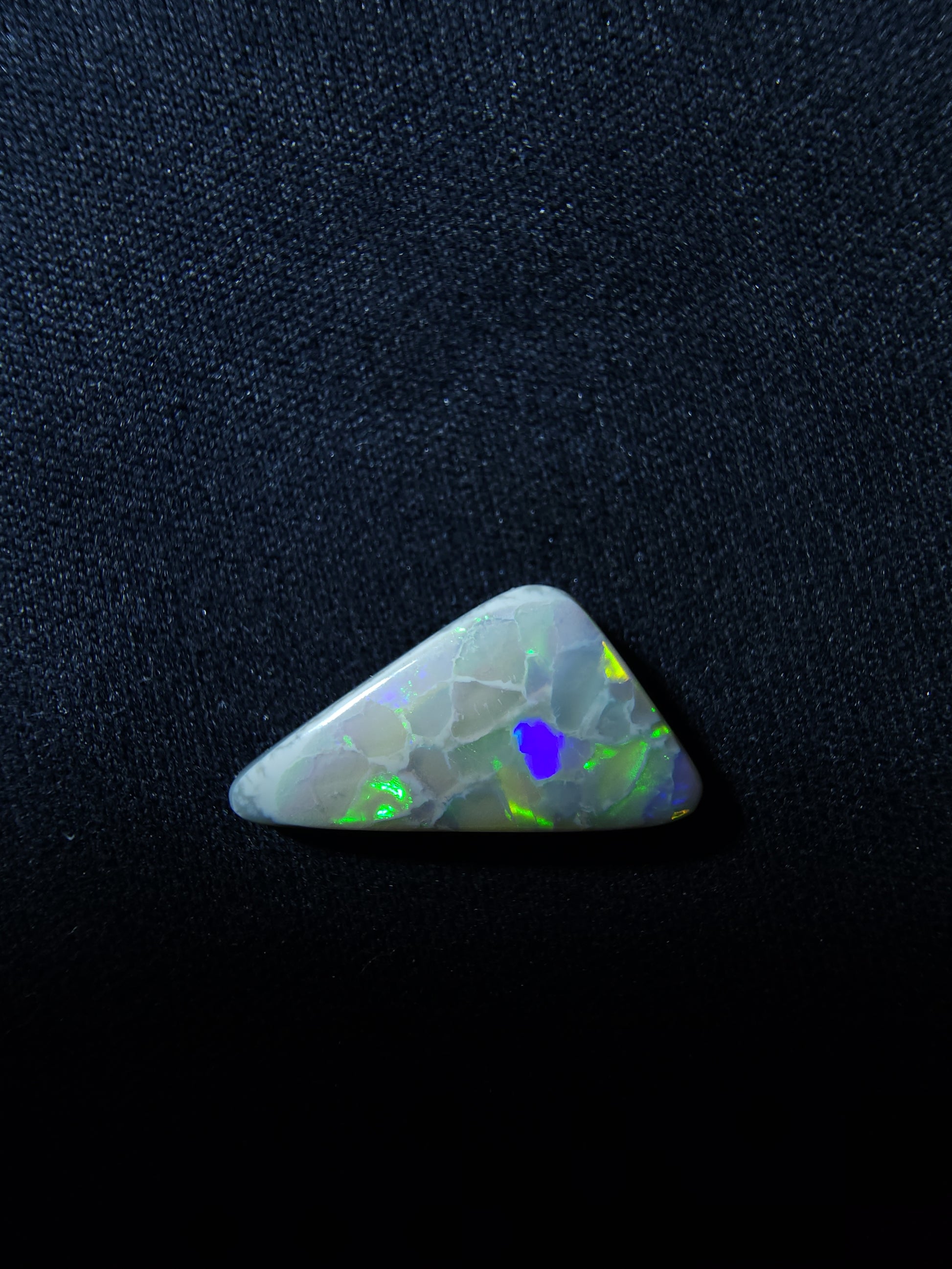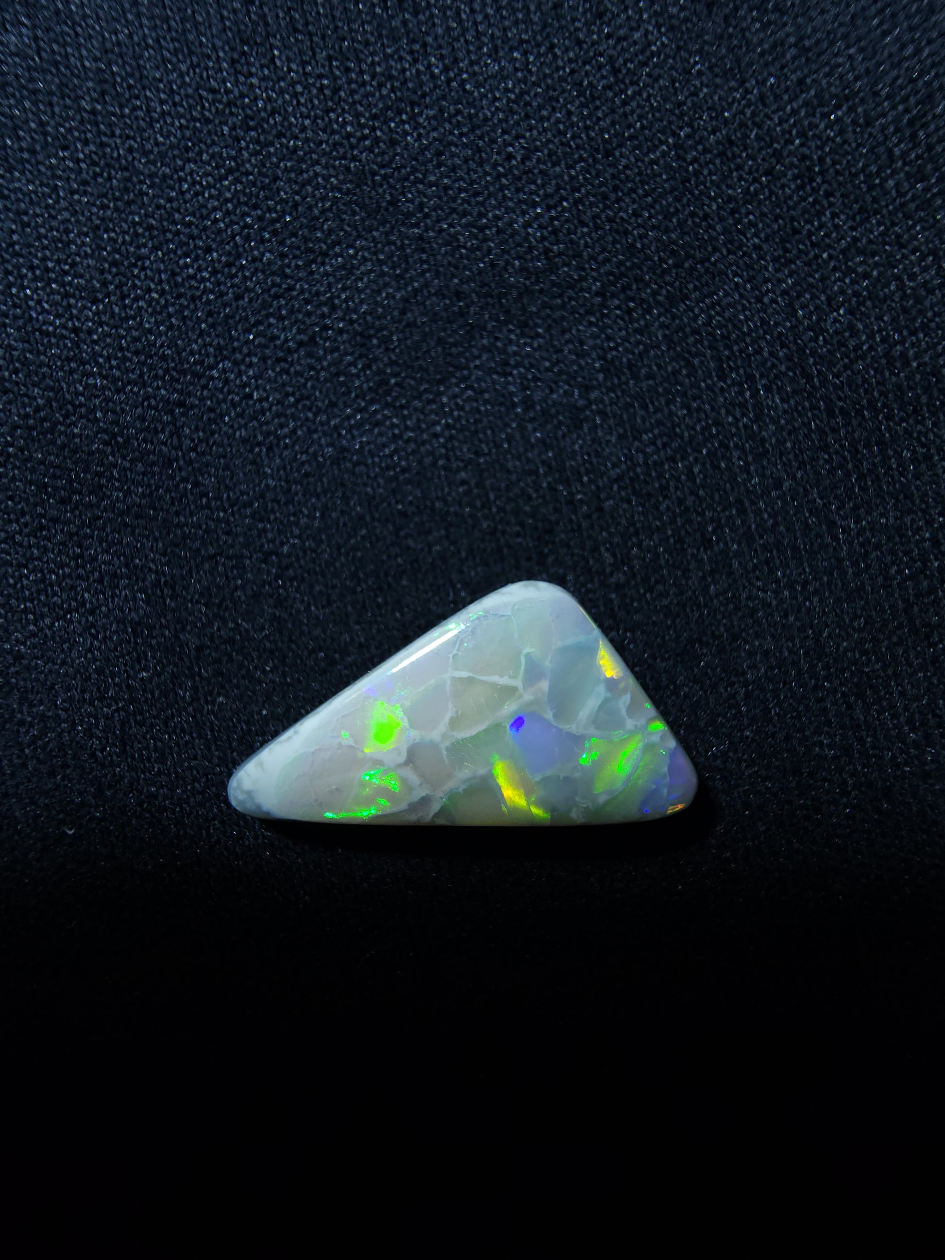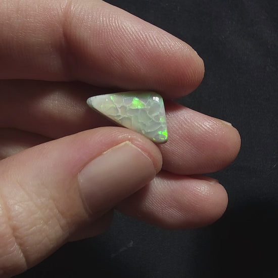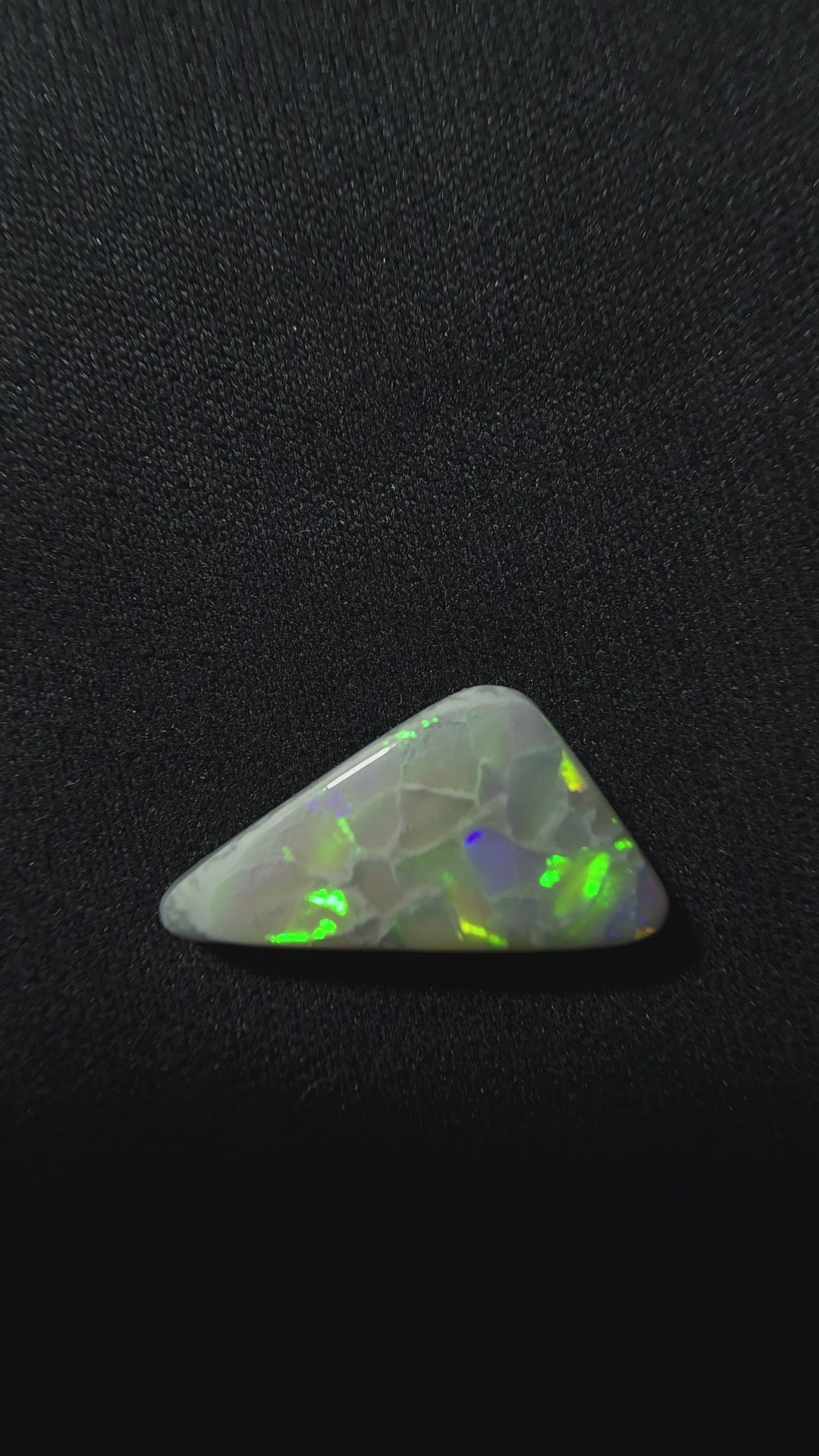 A natural Lightning Ridge seam opal with a bright green mosaic-style pattern across the face. Cut into a modern freeform shape, this stone shows crisp green flashes with hints of blue and yellow under direct light. A smooth, low-profile dome makes it an easy piece for bezel setting, pendants or contemporary ring designs.