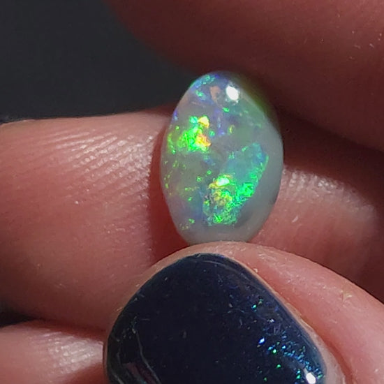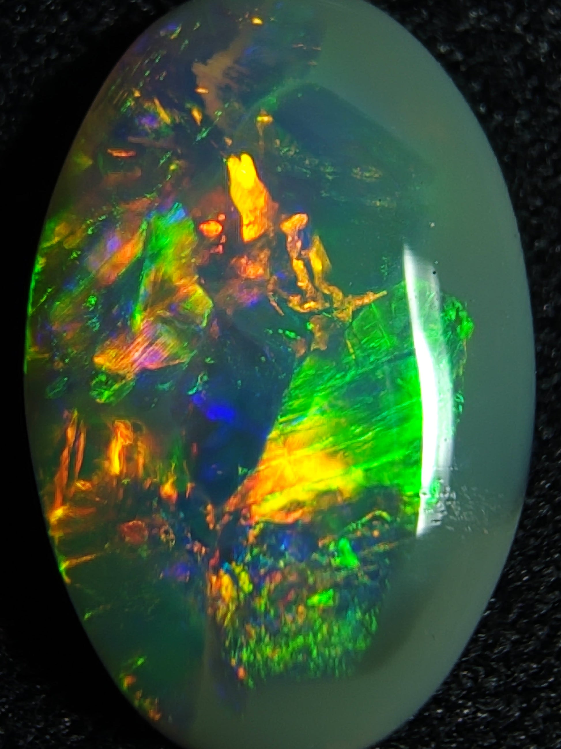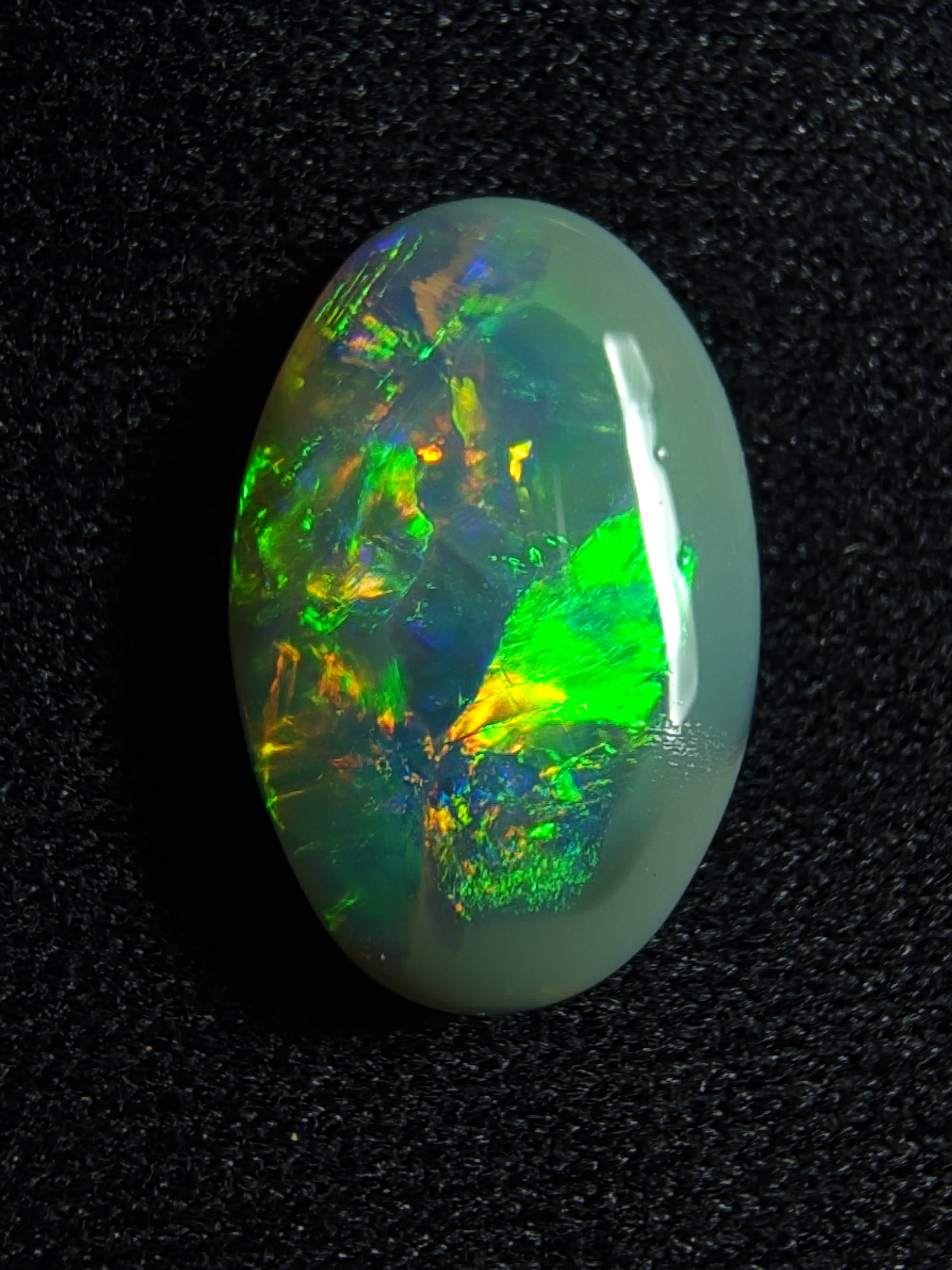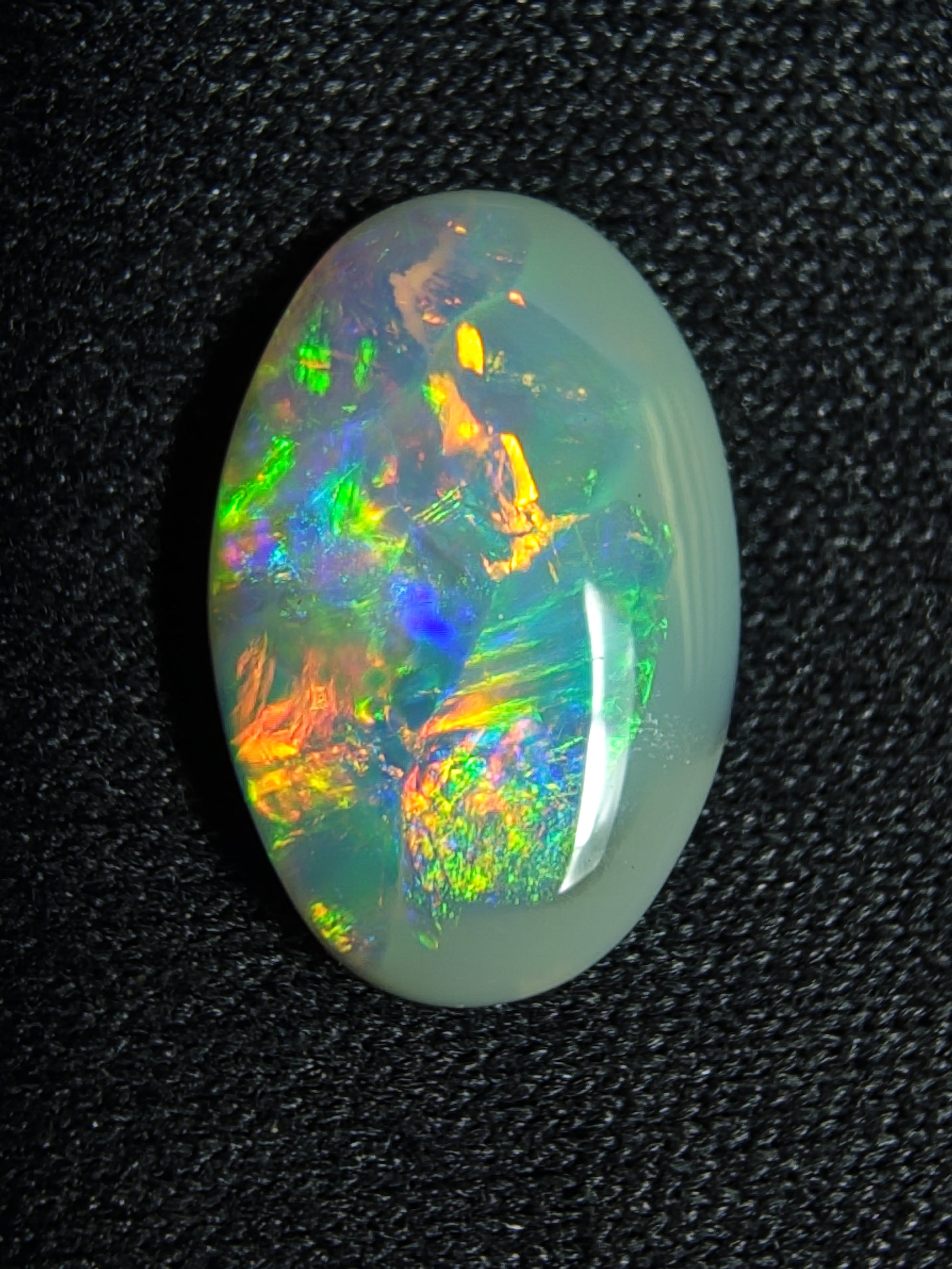 This 1.15ct solid opal comes from Lightning Ridge, Australia — Known for their rarity and breathtaking colour play on a black base, Lightning Ridge opals are prized by jewellers and collectors around the world. This gem is cut into a low-dome oval cabochon, bursts with fiery magenta, glowing orange, emerald green, sapphire blue, amethyst purple, and golden yellow it has a very special mixed pattern that is truly unique.
