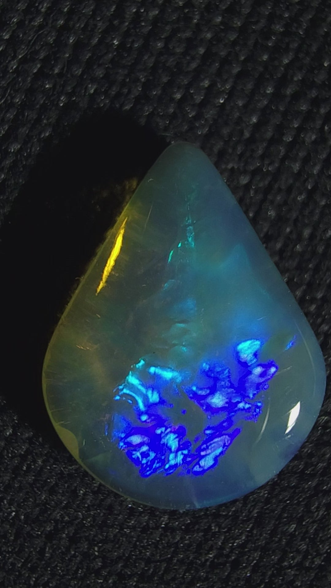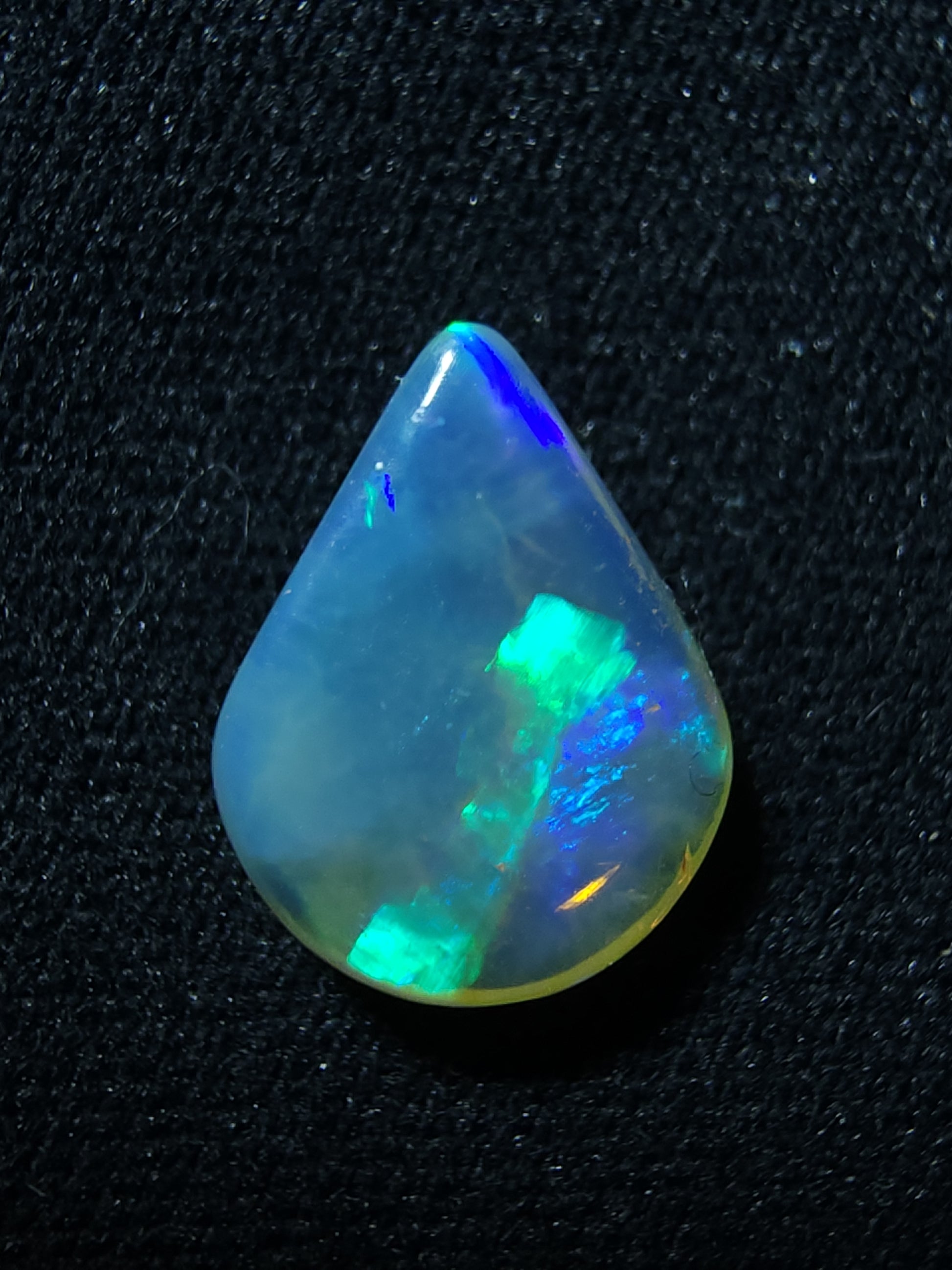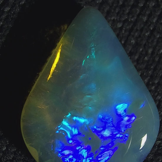 This exquisite 0.85ct Lightning Ridge crystal opal showcases an elegant teardrop cabochon cut, illuminated by vivid blue and green flashes that ignite with light. Its broad rolling flash and ribbon pattern create a captivating display, both striking and refined. Untreated and 100% natural, this opal embodies timeless beauty — a rare treasure from the heart of Lightning Ridge, destined to elevate any fine jewellery piece.