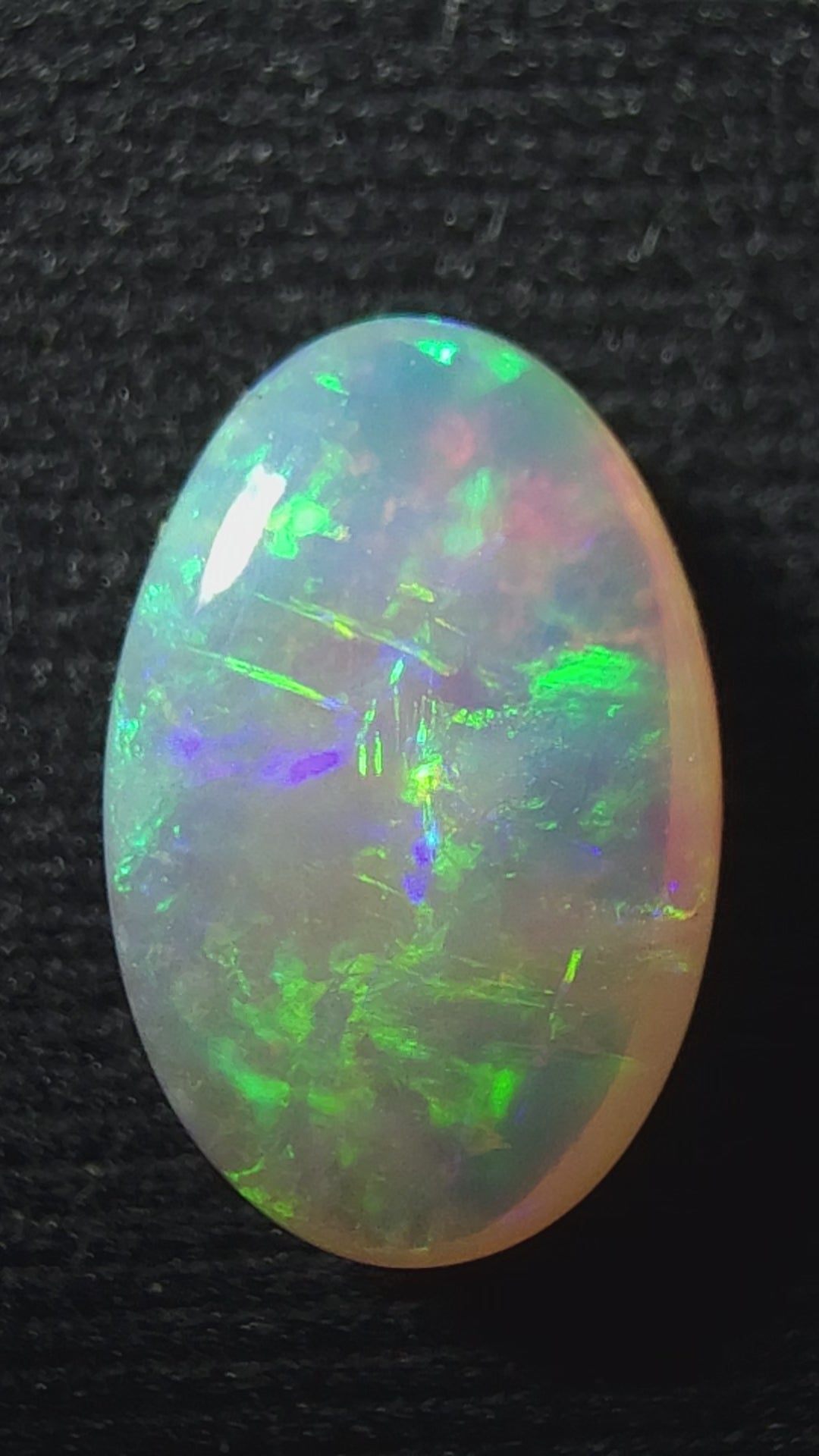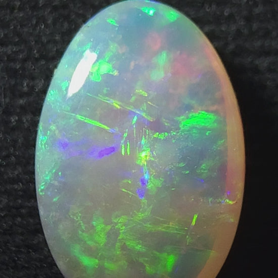 With its rare blend of yellow, green, blue, and orange tones, this 0.90ct Lightning Ridge crystal opal displays vivid floral flashes that light up the stone. The oval cabochon cut enhances its balance and elegance, making it a perfect choice for fine jewellery or a standout collector’s gem.